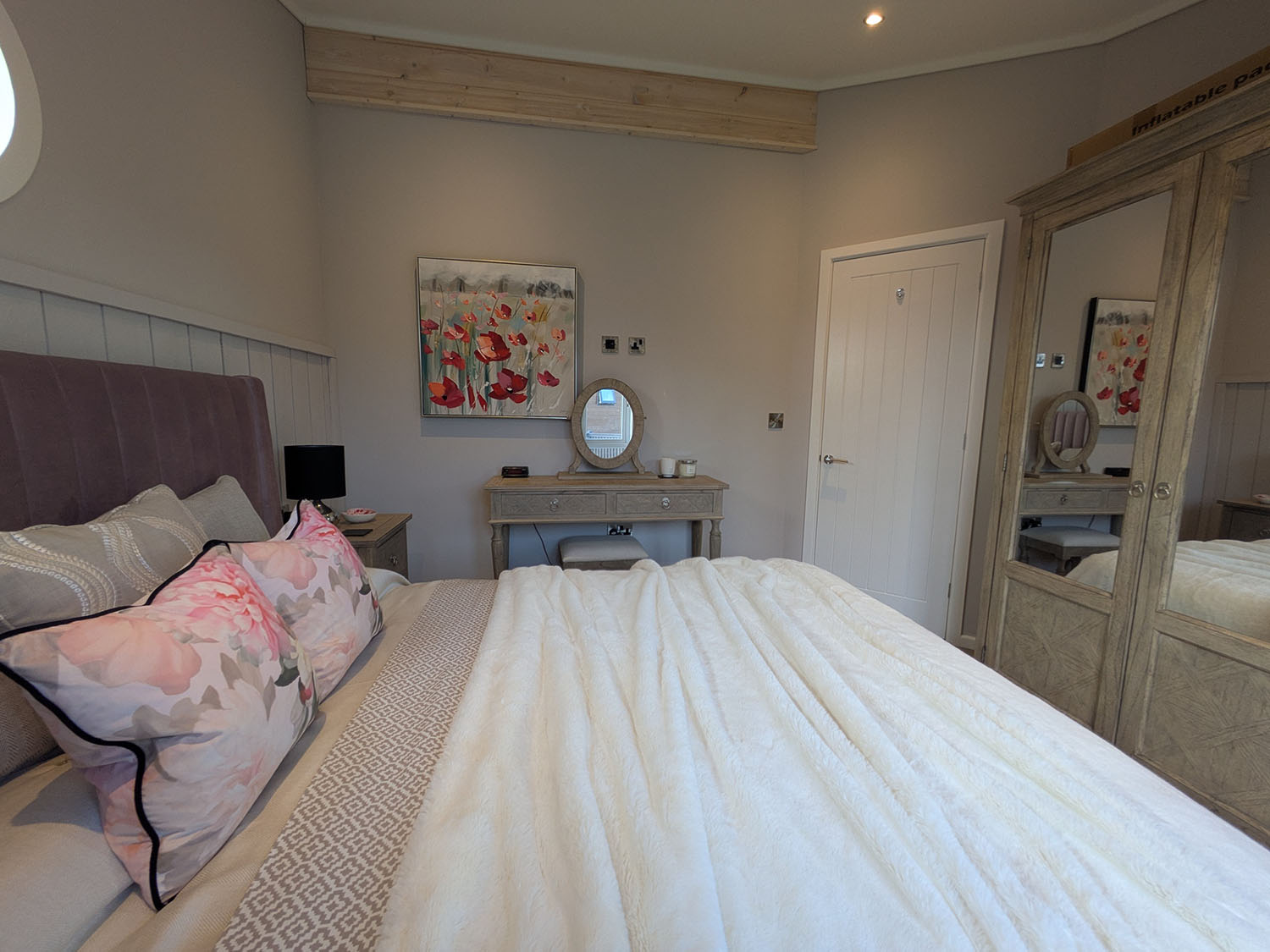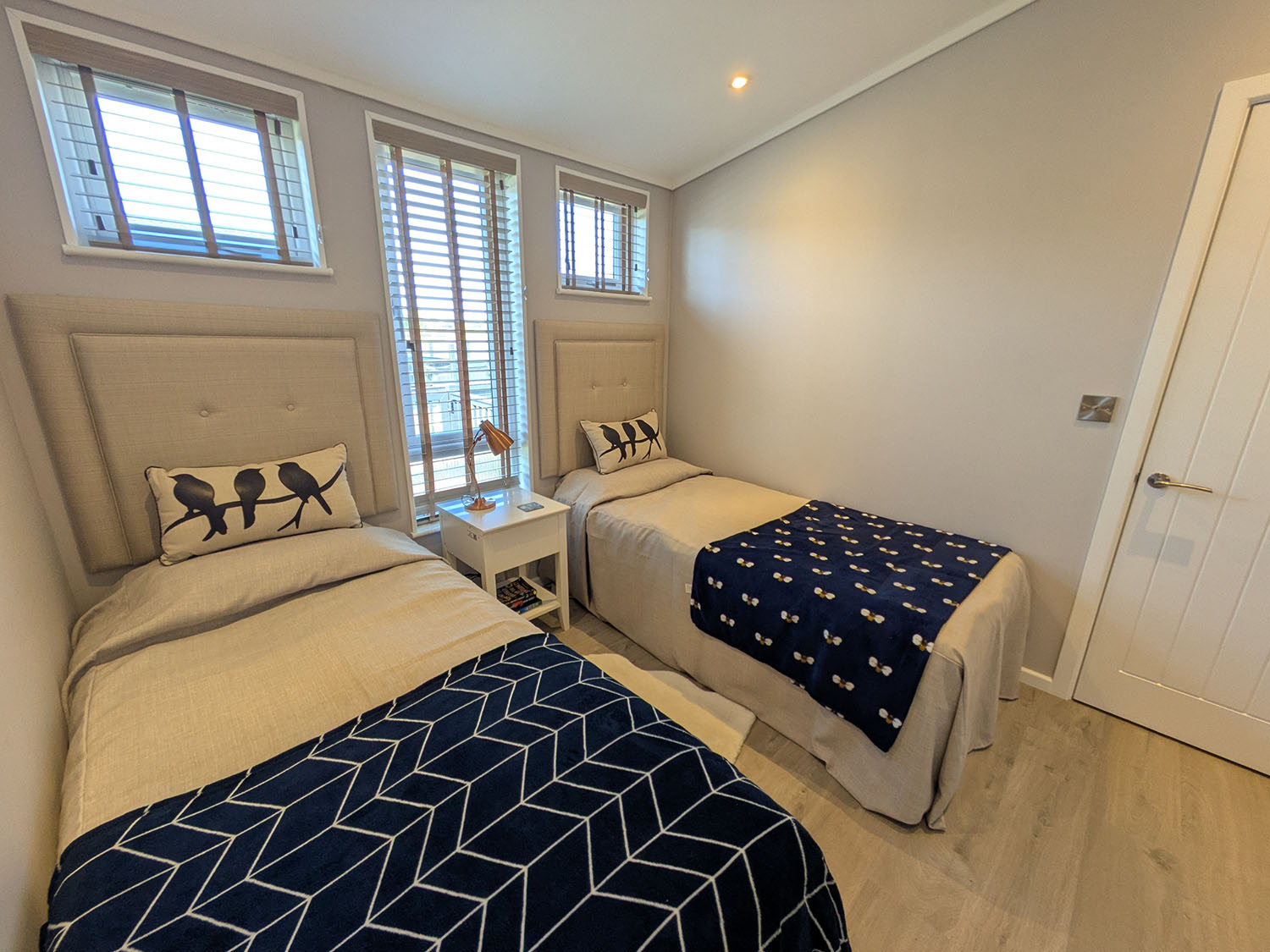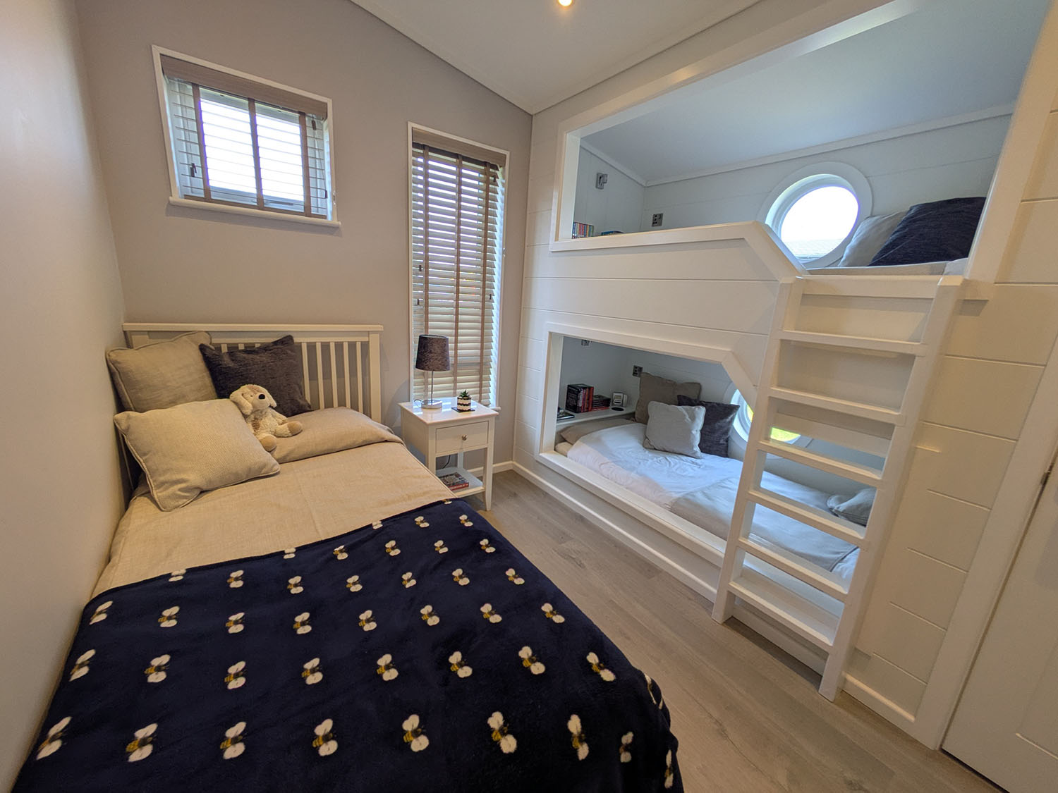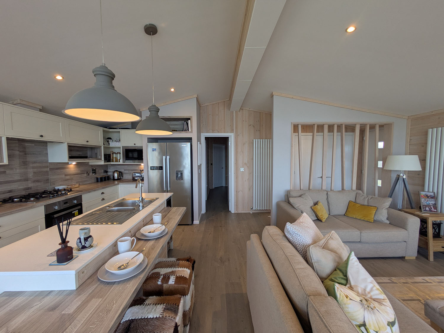 Muted tones, textured finishes and basket weave light fittings create a calming atmosphere, while the décor ensures comfort and style throughout. The master bedroom includes a king-size bed and high-spec ensuite, while the twin room can be adapted to a super king. A third bedroom offers three single beds, including built-in bunk cabins – a favourite for children.