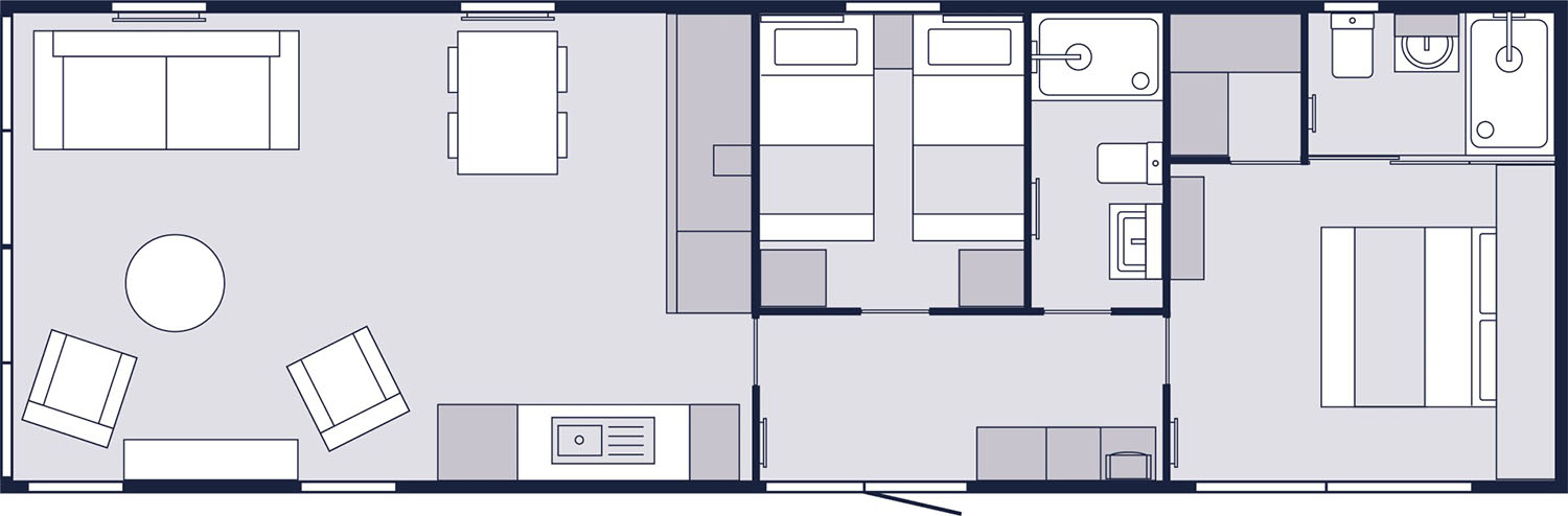 This stylish 2-bedroom lodge is the largest single unit in the Victory range – and it shows. With its striking modern design, sleek black trim fixtures, and a handleless kitchen that wouldn’t look out of place in a city apartment, it’s a real head-turner.