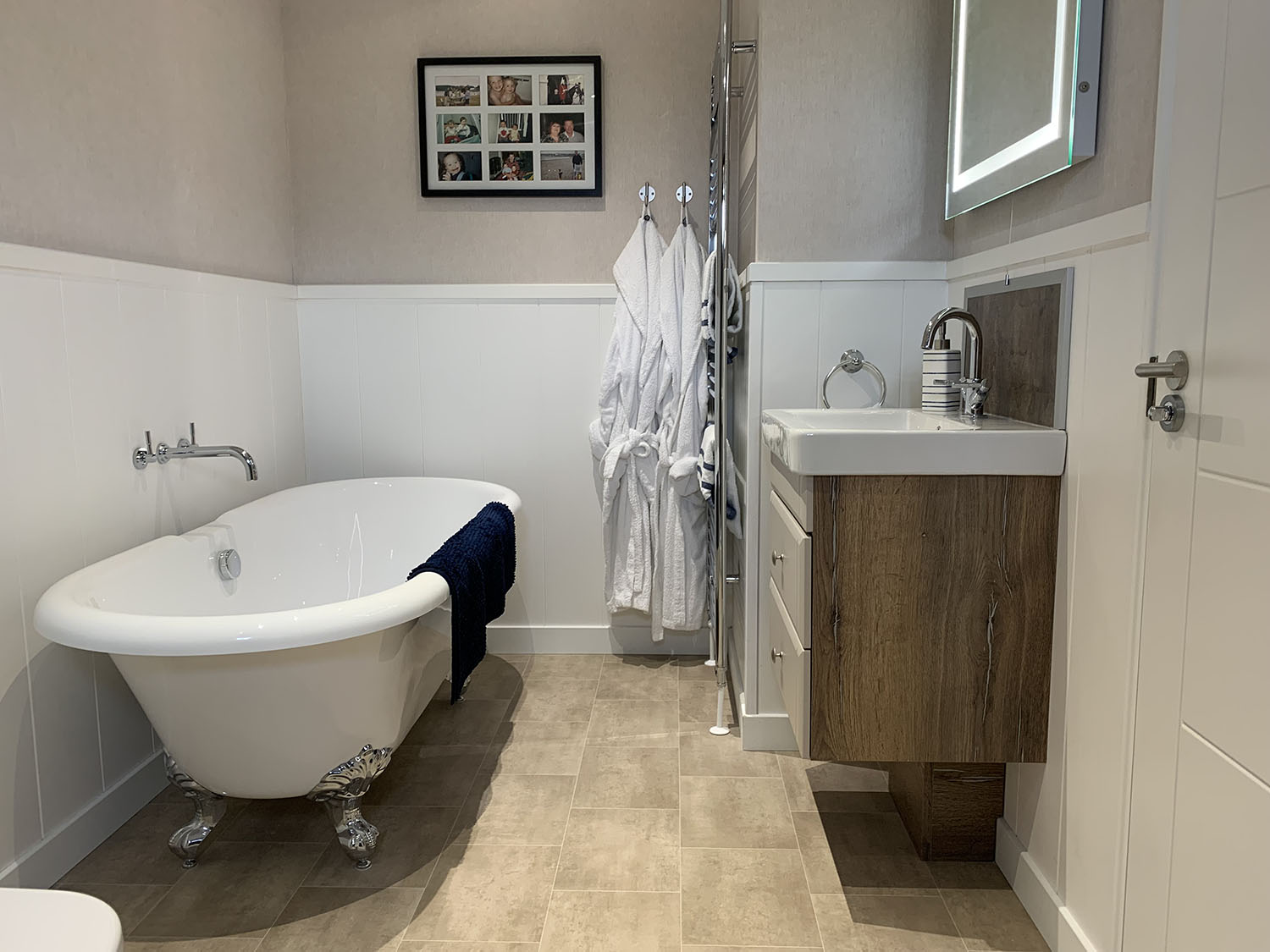 Bedroom 1 has patio doors leading directly to decking and hot tub. King size bed with dressing and vanity area with fully fitted wardrobes. Ensuite with walk in rain shower and roll top bath.