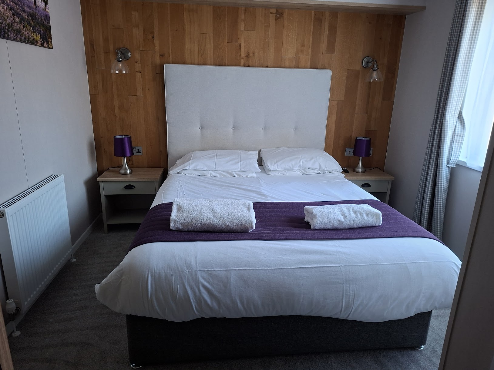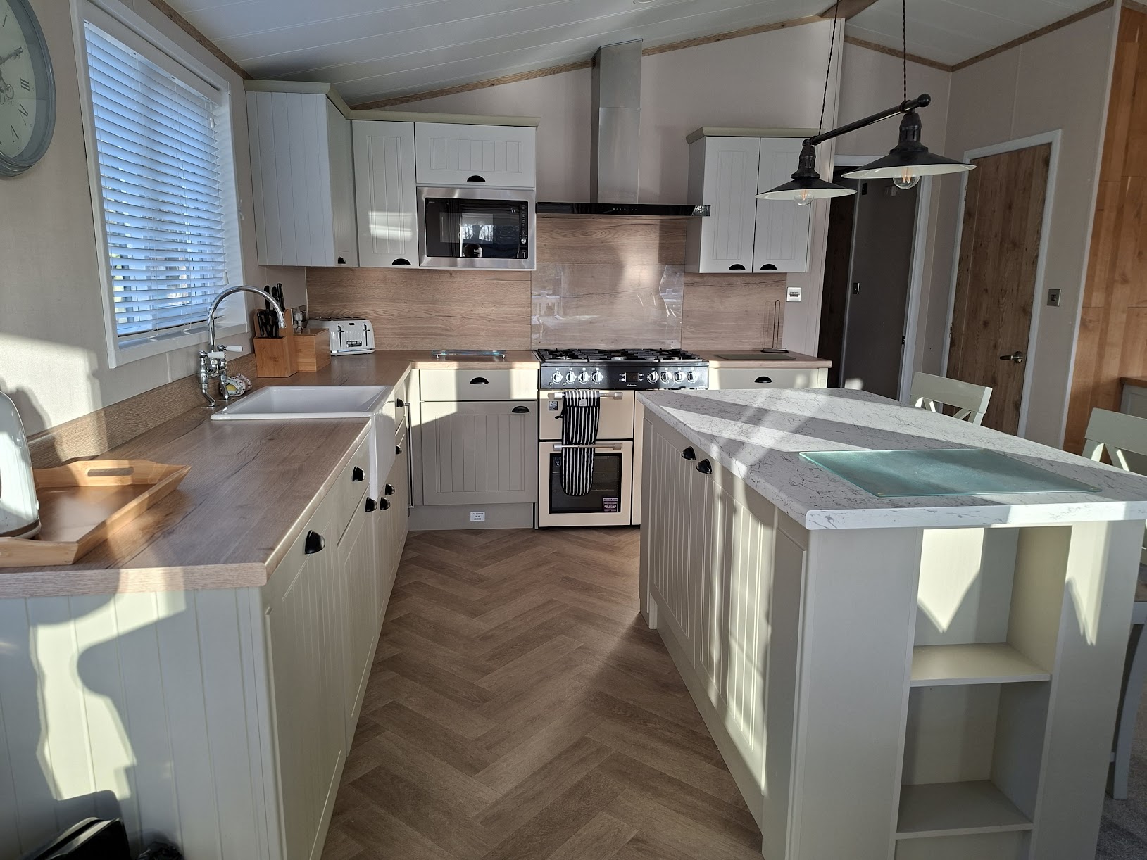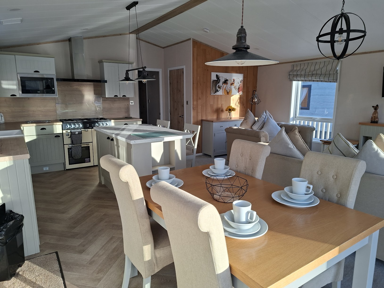 Measuring 40' x 20', the lodge features a bright open plan lounge, dining and kitchen area designed for comfort and easy entertaining. The kitchen is fully equipped with integrated appliances and a characterful multi fuel range cooker. There are two bedrooms, including a generous main bedroom with an en suite bathroom with shower over bath, plus a separate family shower room. The sofa in the lounge converts to a sofa bed to sleep 2 extra guests.
