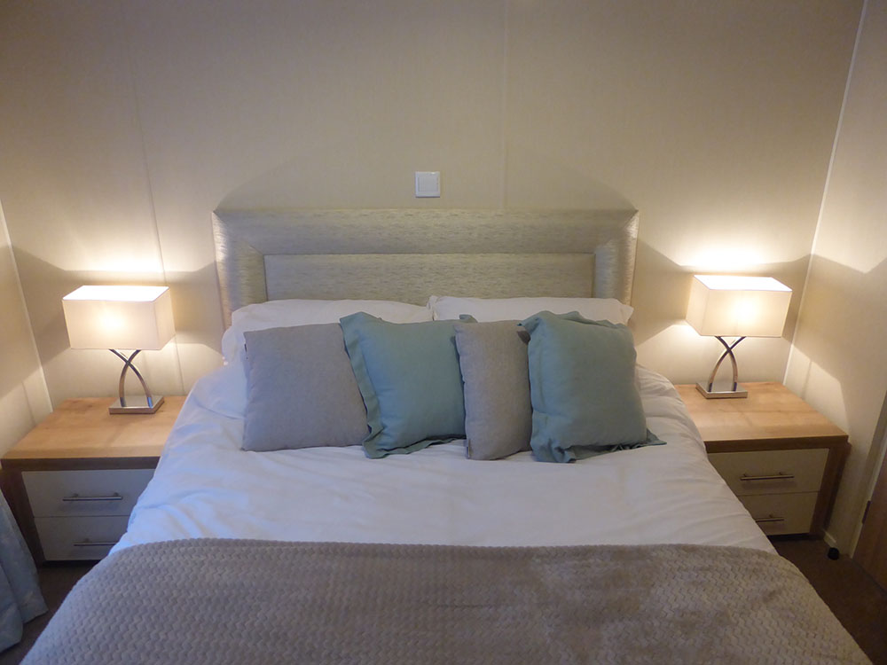 Has a modern electric fire and built in shelving, TV point, radiators, four double glazed windows and double glazed patio doors which open to the decked area next to the lake. Full size dining table and set of 6 chairs are included as well as 2 sofas and recently been fitted with quality modern herringbone floor.